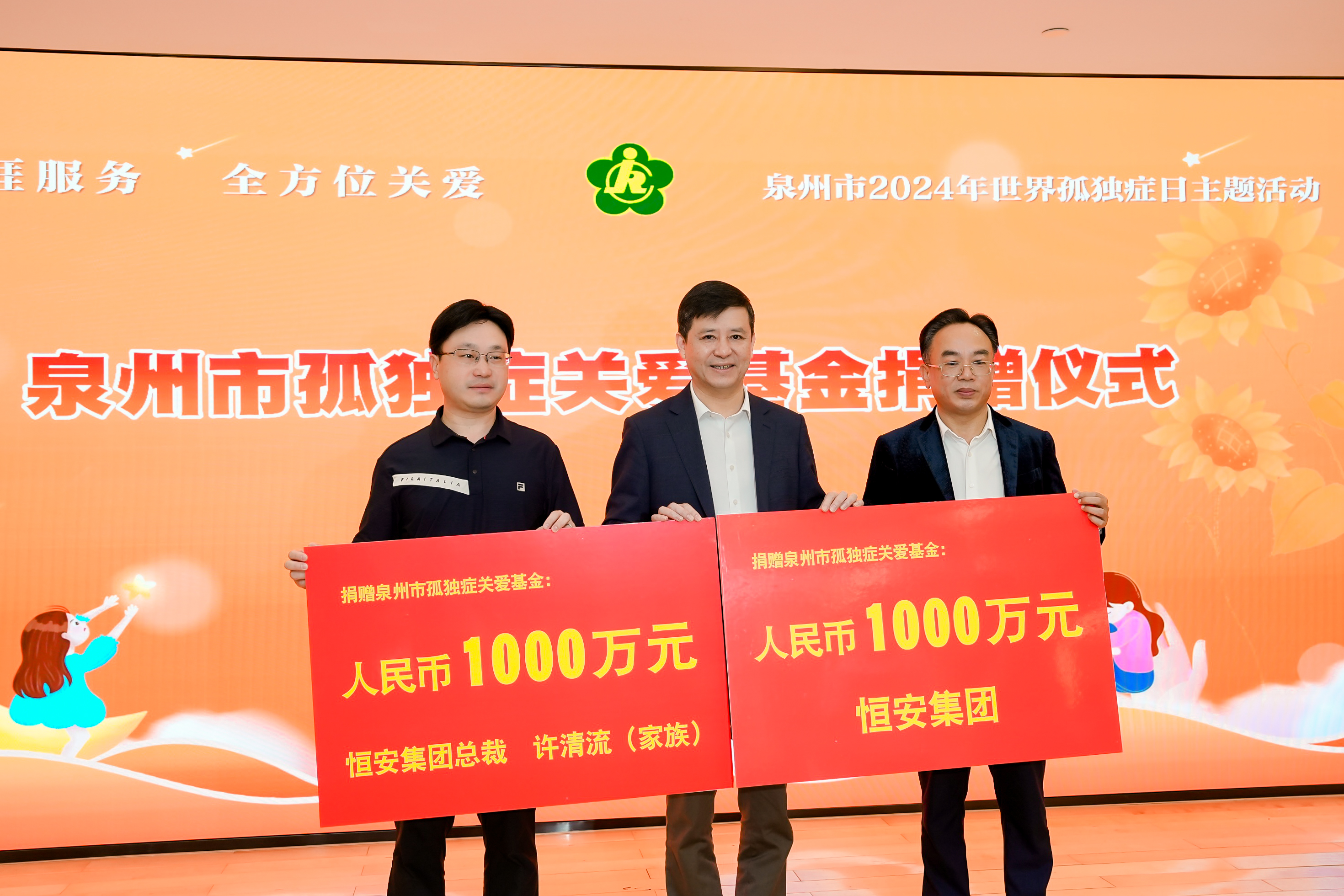 泉州市人大、市殘工委發起成立泉州市孤獨癥關愛基金, 彩神創始人許連捷及公司高層第一時間響應并支持,以恒安名義捐贈2000萬元,其中集團捐贈1000萬元,總裁許清流家族捐贈1000萬元,同時恒安的多位股東也紛紛貢獻出自己的一份心意。許大座副總裁、陳發沛總監分別代表集團及許清流家族上臺捐贈。