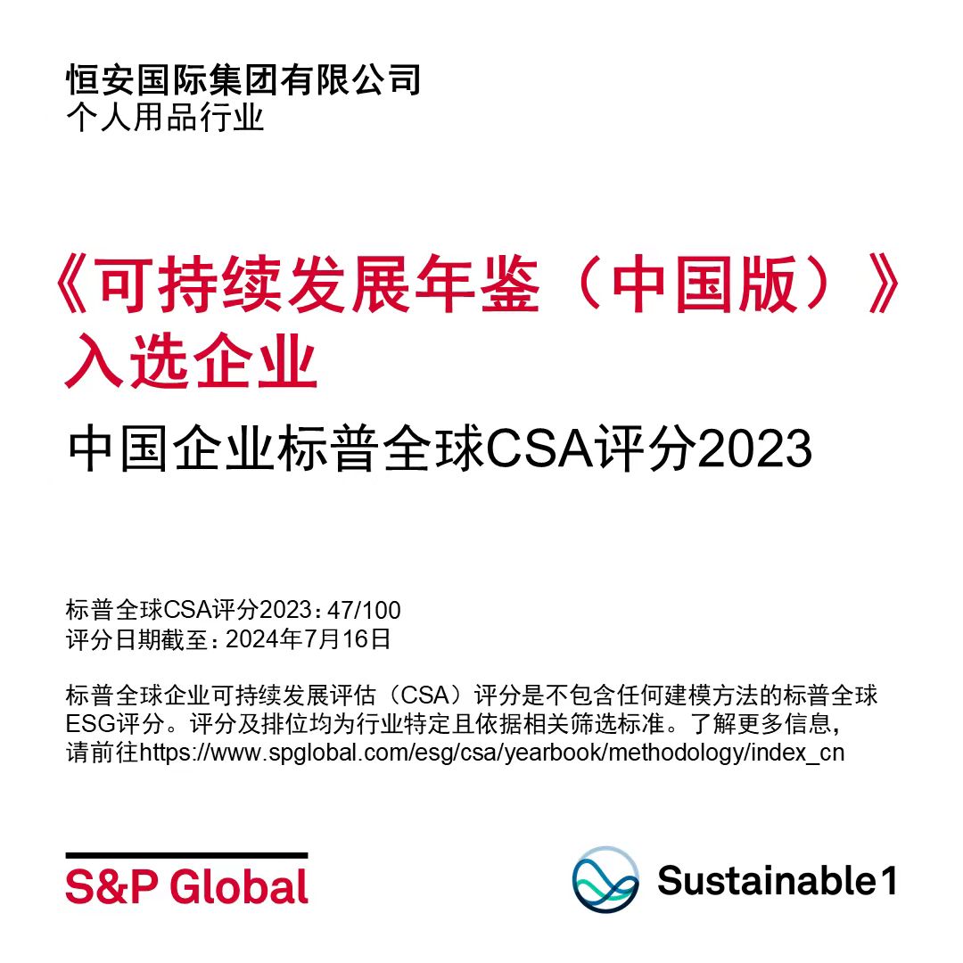 7月16日,標普全球《可持續發展年鑒(中國版)2024》正式發布,恒安國際集團有限公司連續兩年入選標普全球(S&P Global)《可持續發展年鑒(中國版)》。恒安此前在企業可持續發展評估(CSA)的評選中連續兩年表現優異,分數已超過行業平均分,領先84%的同行,彰顯恒安作為可持續發展的引領者,積極推行環境、社會及企業管治(ESG),將社會和環境責任融入業務運營,實現綠色發展。