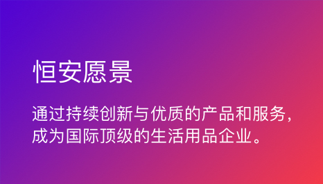 恒安堅(jiān)持“誠(chéng)信、拼搏、創(chuàng)新、奉獻(xiàn)”的精神,以“追求健康,你我一起成長(zhǎng)”為使命,通過(guò)持續(xù)的創(chuàng)新與優(yōu)質(zhì)產(chǎn)品服務(wù),致力成為國(guó)際頂級(jí)的家庭生活用品企業(yè)。